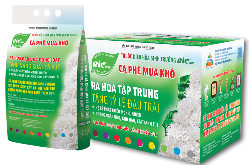 Thuốc Điều hòa Sinh trưởng RIC 10WP Cà phê Mùa khô giúp cây Cà phê hấp thu lượng phân bón NPK tăng thêm 30%, năng suất được tăng thêm 20%, chi phí giảm dần theo thời gian, cây luôn xanh tốt. Chuyển hóa dinh dưỡng nhanh và điều hòa cho cây Cà phê chống các yếu tố bất lợi của môi trường. Giúp cây ra hoa đậu quả đồng loạt, không ra hoa chanh, cuối vụ trái chín đều. Tỷ lệ đậu quả đạt cao, hệ rễ phát triển nhiều giúp quần thể vi sinh vật có lợi phát triển mạnh.